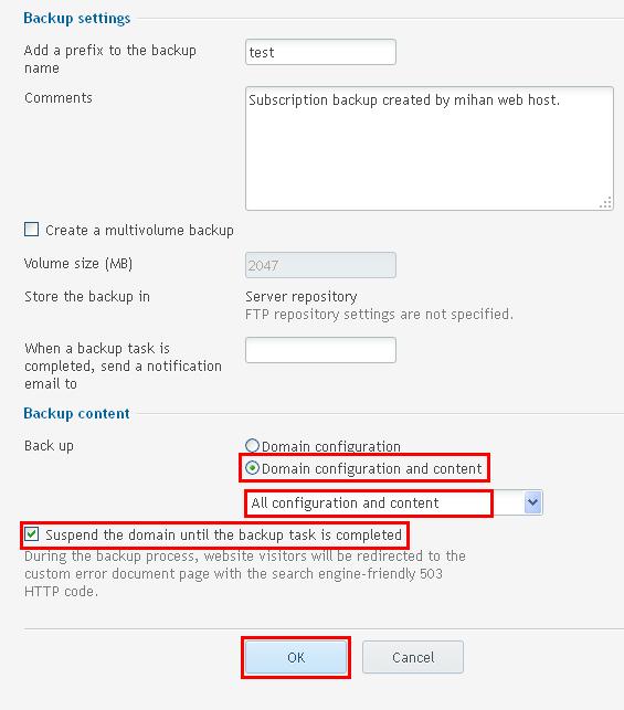 با انتخاب گزینه Domain configuration and content از تمامی اطلاعات روی هاست شما یک فول بک آپ تهیه خواهد شد .